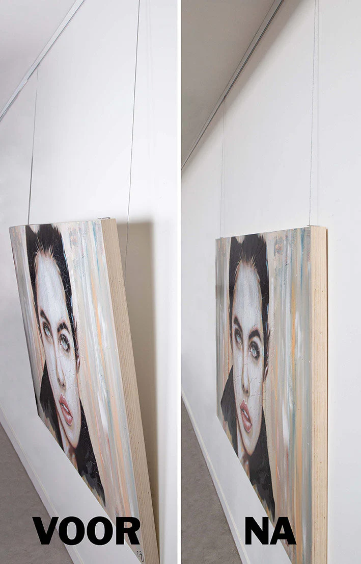 The STAS no-tilt set is supplied as a complete set for a painting with a wooden frame up to 60 mm and at least 18 mm thick. This set is only suitable for large frames with a floor at the back and the frame should be hung with two STAS cords (perlon/steel) and 2 suspension hooks (STAS zipper/STAS smartspring).Features
