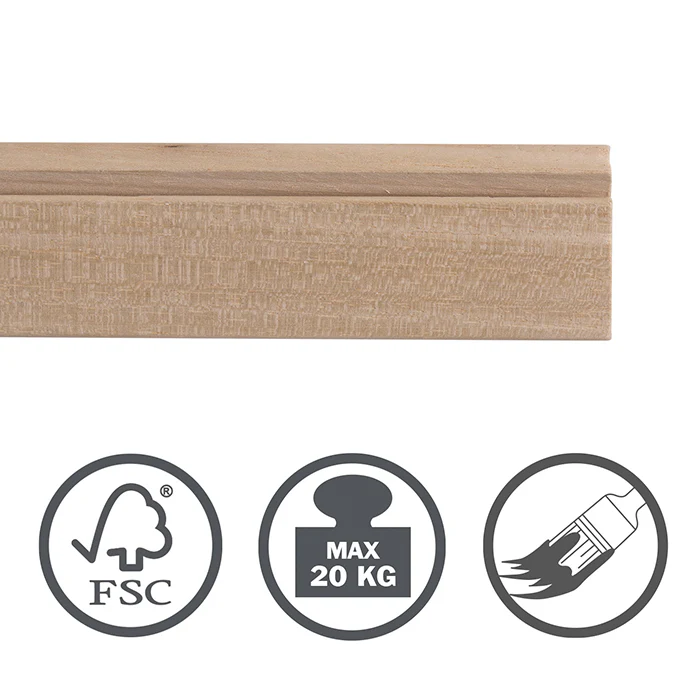 Our wooden rails are made out of Ayous wood and are FSC and PEFC certified. Ayous wood differs from other, cheaper wood since it does not deform nor splinter, and is perfectly suitable to repaint because of its smooth texture. Perfect wood for your picture hanging system! Can be mounted with screws, nails and glue*.